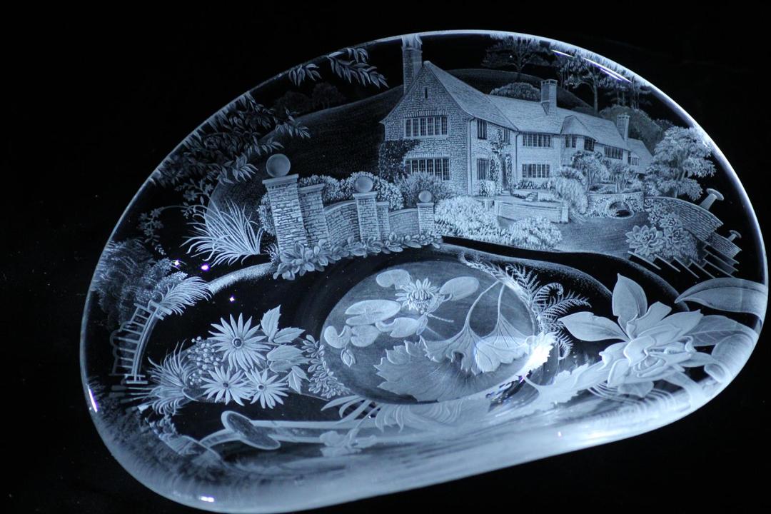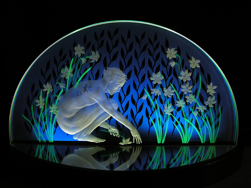 This wheel engraving is “Narcissus” by Alison Kinnaird.