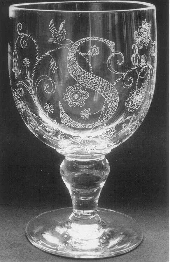Point engraving also called line engraving, involves marking the glass with a hand-held diamond or tungsten carbide point. Line engraving was at one time called ‘scratch engraving’ which exactly describes it. The point, held in the hand or on the end of a scriber, scratches the surface of the glass, making a contrasting white line which sparkles in the light. The effect is quite different from the mark made using a wheel or drill. (It is also unlike “Stipple” where the engraver makes a series of small dots by tapping the tool against the glass. The closer the dots the whiter that part of the image becomes.)