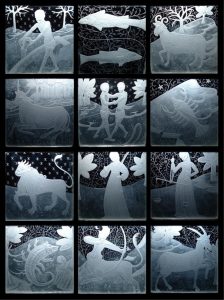 This image is of an window engraved with the 12 signs of the Zodiac by Freddie Quartley.